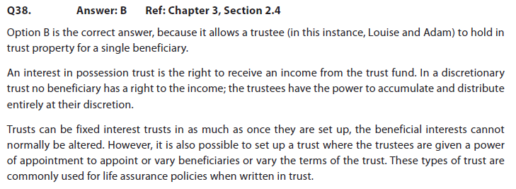 • On Question 38, which reads “Which of the following types of trust is the most suitable for Louise and Adam, who wish to set aside money for their grandchild? The funds will not be accessed until the grandchildren reach the age of 21.”